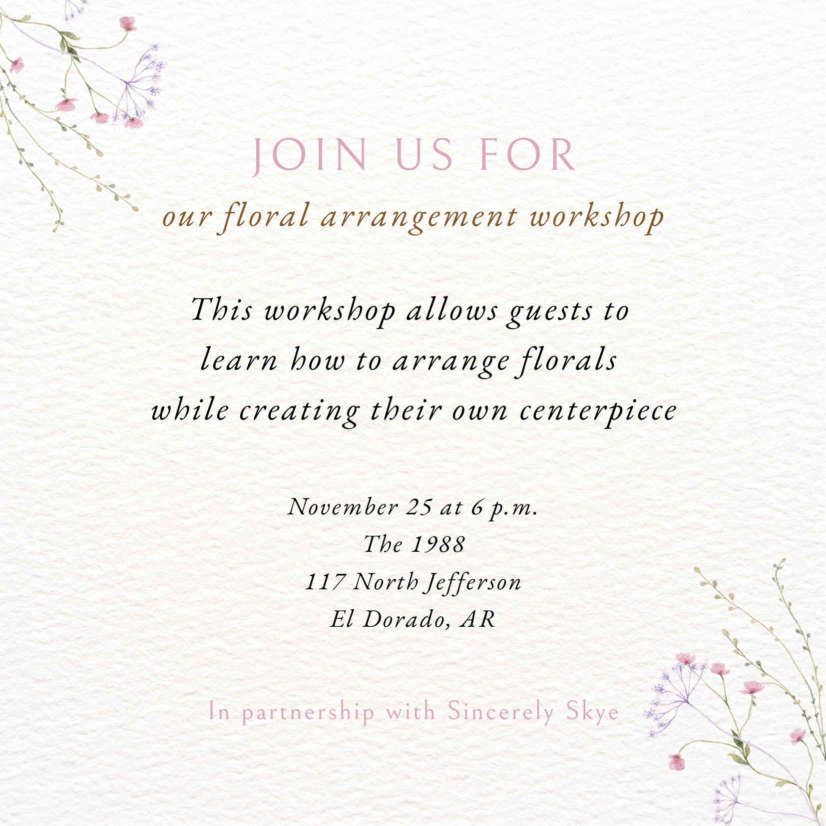 This class will take place on Tuesday, November 25 at 6 p.m. The ticket is $60 and includes instruction on floral arranging, all florals for making your own arrangement plus light refreshments. Each guest will take home one arrangement that they create during the event.