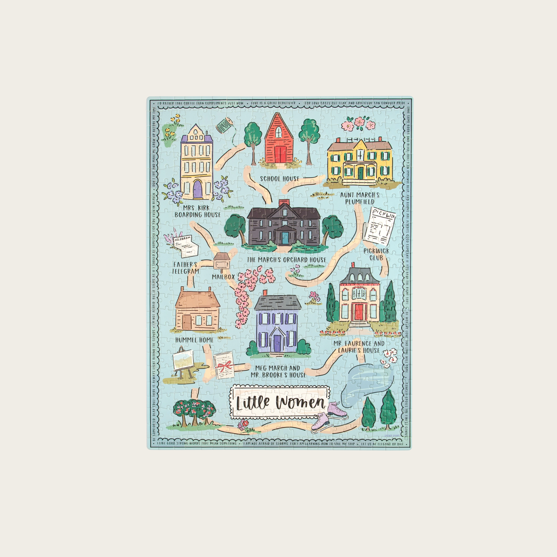 Step into the world of Little Women with our 500-Piece Jigsaw Puzzle, featuring an illustrated map of iconic locations from Louisa May Alcott's beloved novel. As you assemble the puzzle, explore memorable sites like Mrs. Kirke's Boarding House, the March family’s Orchard House, Aunt March's Plumfield, and the Pickwick Club. Visit Mr. Laurence’s house, Laurie’s home, Meg and Mr. Brooke’s charming residence, and the Hummel Home, all designed to evoke the spirit of sisterhood and family. Perfect for readers of all ages, this puzzle makes a thoughtful gift and a nostalgic way to celebrate the March sisters’ journey.